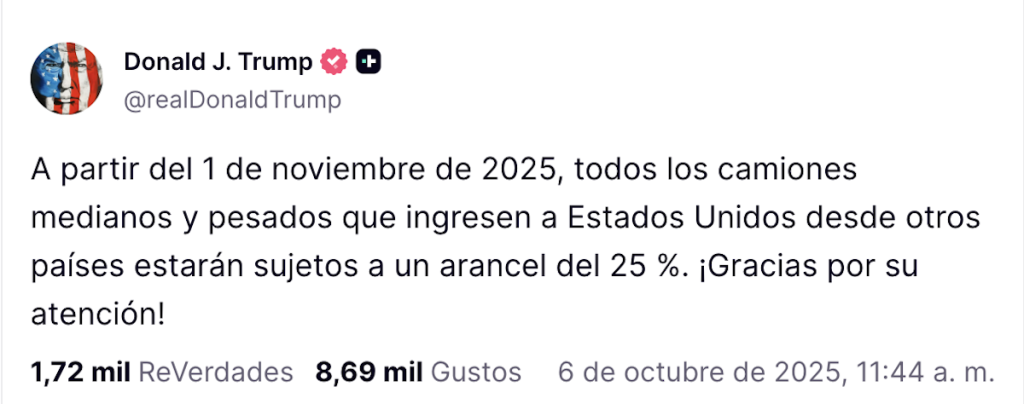 “A partir del 1 de noviembre de 2025, todos los camiones medianos y pesados que ingresen a Estados Unidos desde otros países estarán sujetos a un arancel del 25 %. ¡Gracias por su atención!”, escribió Trump este lunes en su red Truth Social sin dar más detalles.