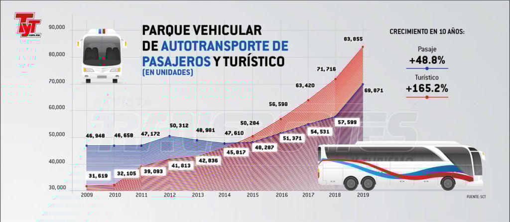 Sobre el transporte turístico, desde 2015 este segmento superó al servicio público federal en cantidad de unidades registradas ante la Secretaría de Comunicaciones y Transportes. Y, de hecho, en los últimos cuatro años ha mostrado aumentos a doble dígito.