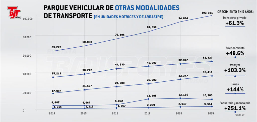 De hecho, ha sido por el dinamismo con el que han crecido, que la SCT decidió incluirlos en este informe. Por ejemplo, las unidades transfer duplicaron su parque vehicular en cinco años, al pasar de 17,907 en 2014 a 36,411 en 2019.