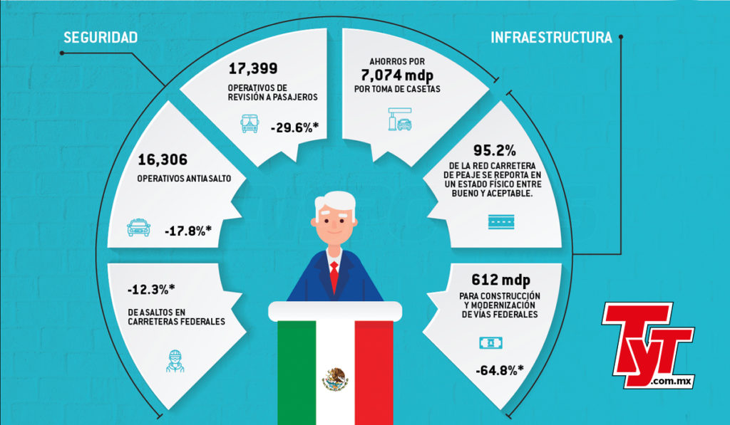 En cuanto a la toma de casetas, el Tercer Informe de AMLO indica que se evitaron pérdidas económicas en las plazas de cobro por 7,074 millones de pesos (mdp) de enero a junio de 2021, en vías de Baja California, Sinaloa, Estado de México y Ciudad de México. Asimismo, se dispuso de 103 y 152 elementos de seguridad en las casetas instaladas en Nayarit y Sinaloa, respectivamente, así como 39 efectivos en las de Tlalpan.