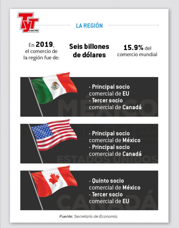 Es importante destacar que, en 2019, los tres países representaron el 18.3% del PIB mundial, colocándose como la segunda economía global; su comercio significó seis billones de dólares, equivalente a 15.9% del comercio mundial, de acuerdo con información de la Secretaría de Economía con datos de la OMC y el FMI.
