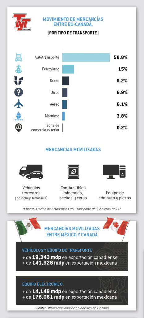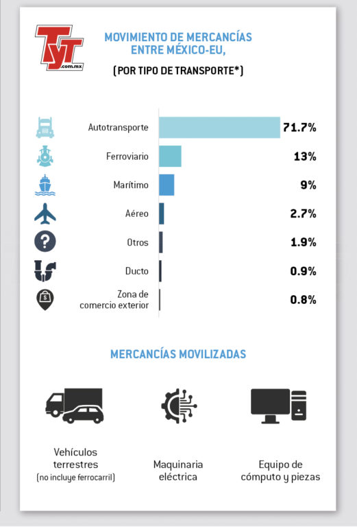 La Oficina de Estadísticas del Transporte del Gobierno de Estados Unidos (BTS, por sus siglas en inglés), revela que en el atípico 2020, ese país movilizó productos por un total de 1.06 billones de dólares con sus socios del T-MEC, en donde el autotransporte y el ferrocarril fueron los medios de transporte más empleados.