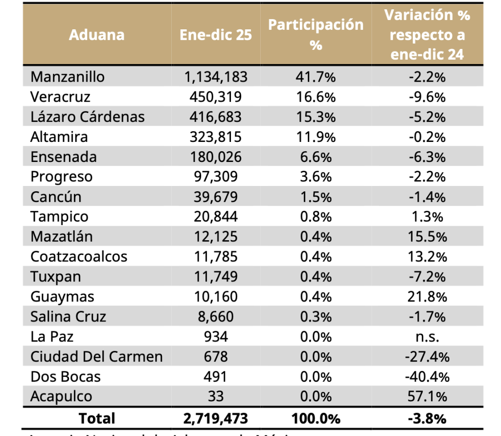 Las 17 aduanas marítimas representan 12.7% del total de las operaciones efectuadas en los 50 recintos ubicados en el territorio nacional. La baja en su actividad refleja un menor dinamismo en la producción manufacturera del país, derivado de los aranceles sectoriales impuestos por Estados Unidos.