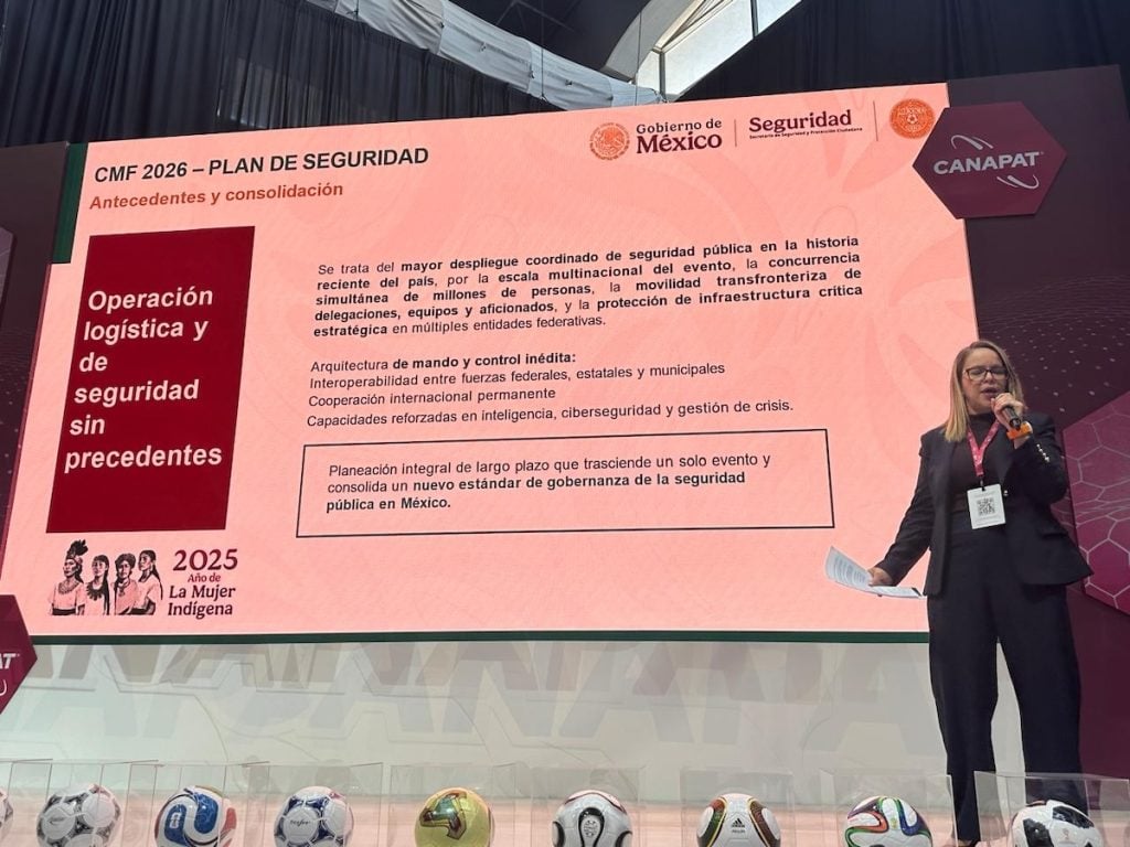 Ximena Escobar, enlace institucional para el Mundial de la Secretaría de Seguridad y Protección Ciudadana (SSPC), destacó la implementación del Plan Kukulcán para resguardar la seguridad de personas y empresas durante esta celebración deportiva.