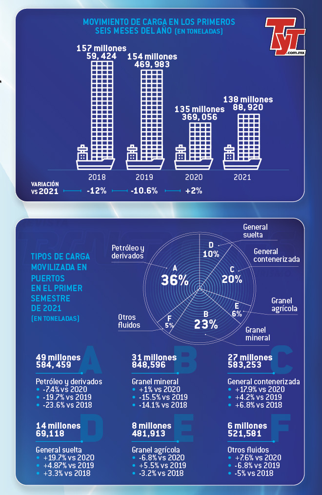 Para este 2021, el panorama reporta una tendencia positiva, pero sin consolidarse por completo. Si bien en el primer semestre del año ya se registran 138 millones 88,920 toneladas de carga movilizada en puertos mexicanos —un natural crecimiento del 2% frente a los bajos resultados de 2020—, la cifra aún se coloca por debajo de lo registrado en los mismos periodos de 2019 y 2018, con descensos del 10.6 y 12 por ciento, respectivamente.