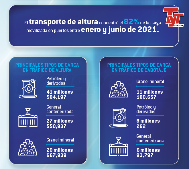De acuerdo con datos de la Coordinación General de Puertos y Marina Mercante, el transporte marítimo de altura continuó como el principal tipo de tráfico. Con un total de 112 millones 642,107 toneladas, incrementó 0.1% comparado con el primer semestre de 2020. Pese a este resultado, aún se encuentra por debajo del comportamiento de 2019 y 2018.
