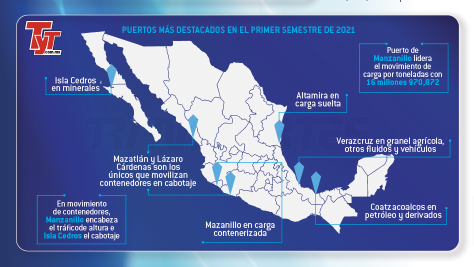 En este comercio entre puertos mexicanos, el granel mineral resultó la mercancía de mayor presencia, llevándose el 44% del total en los primeros seis meses de 2021.
