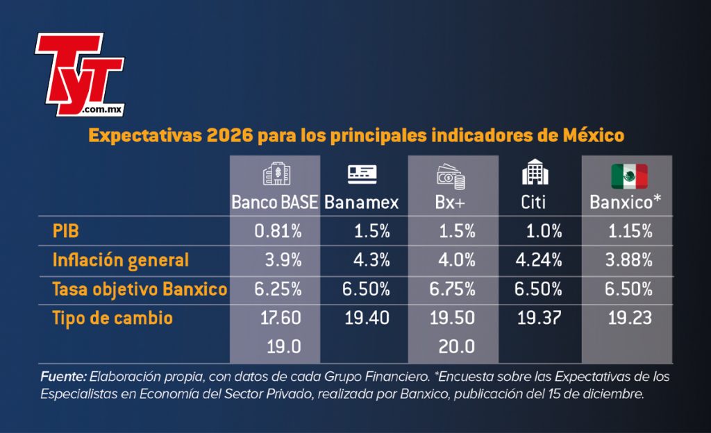 Banamex y Grupo Financiero Ve por Más (Bx+) presentan los pronósticos más optimistas, con un crecimiento estimado de 1.5% del PIB en 2026. Sus analistas consideran que la actualización del tratado comercial reduciría la cautela y daría un impulso a la inversión, especialmente hacia la segunda mitad del año, como un factor central.