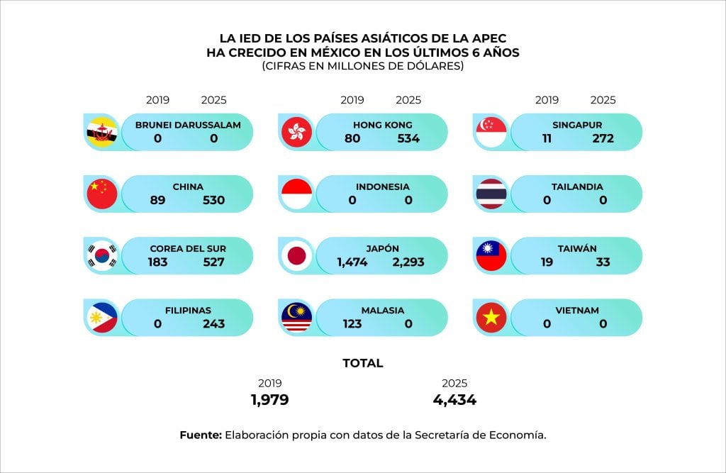 En 2025, los países asiáticos miembros de APEC realizaron inversiones en territorio mexicano por 4,424 millones de dólares y aportaron el 11% de los 40,871 millones de dólares que México captó de IED, de acuerdo con datos de la Secretaría de Economía (SE).