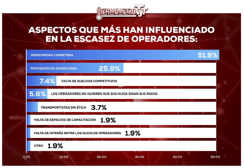 El Termómetro TyT también indagó sobre las razones que más han influido en la escasez de operadores, donde el 51.9% de los encuestados señaló a la inseguridad carretera como la principal causa.