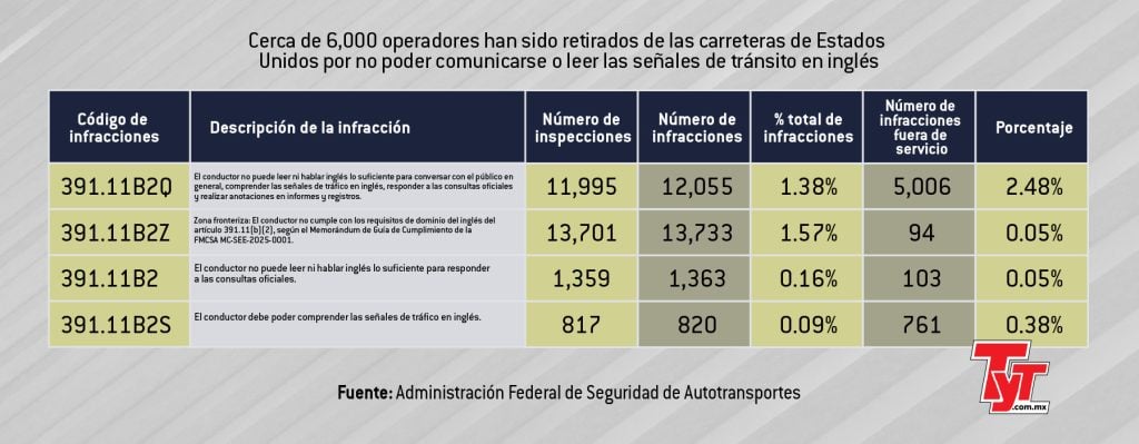 Un promedio de 63 operadores han sido puestos fuera de servicio de las carreteras de Estados Unidos cada día desde finales de junio por no dominar el inglés ni comprender las señales de tránsito en ese idioma, de acuerdo con datos de la Administración Federal de Seguridad de Autotransportes (FMCSA, por sus siglas en inglés).