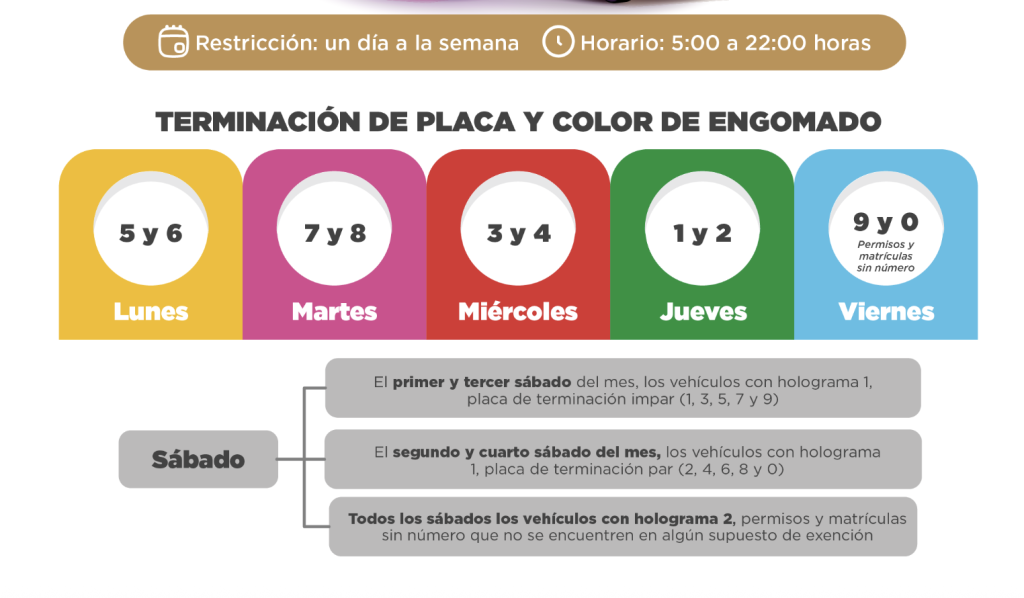 Este Hoy No Circula establece restricciones a la circulación de vehículos con holograma de verificación tipo Uno “1” y tipo Dos “2”, de lunes a sábado, en un horario de 5:00 a 22:00 horas, de acuerdo con el último dígito numérico de la placa de circulación y el color del engomado.