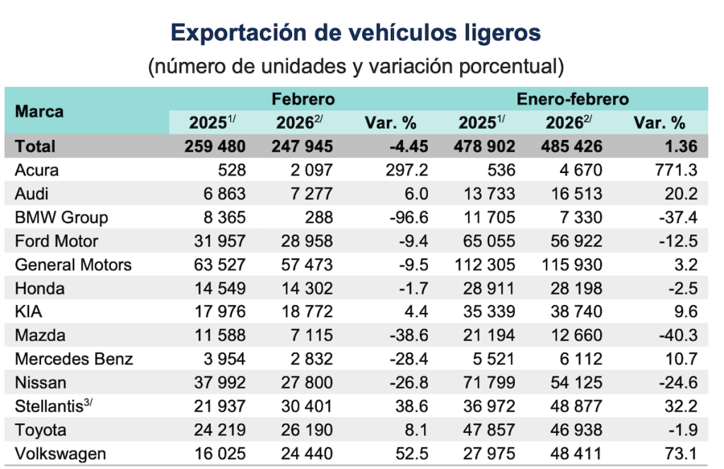 En cuanto a las exportaciones, las cifras del Inegi indican que en febrero se enviaron al mercado exterior 247,945 unidades, una caída de 4.4% respecto al mismo mes de 2025.