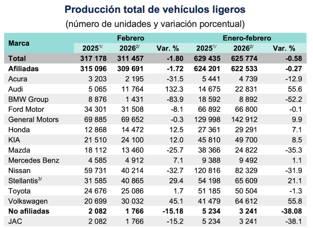 Por marca, General Motors (69,652 autos), Chrysler (40,865), Nissan (40,214) y Ford Motor Company (31,508) fueron las armadoras con mayor producción en febrero, representando en conjunto el 58.51% de toda la fabricación en el mes.
