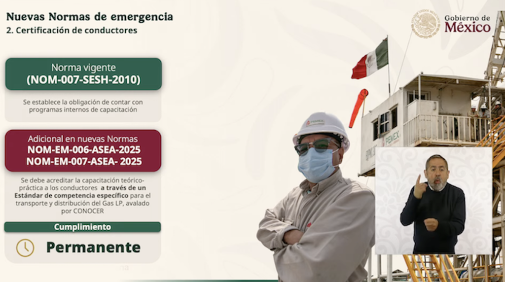“Con la emisión de estas dos nuevas normas se transita hacia un esquema regulatorio en donde el Gobierno reconoce que tanto la velocidad, como las condiciones de manejo y el estado de funcionamiento de las unidades de transporte y distribución de gas LP no solo es materia de tránsito, sino de seguridad industrial y operativa”, destacó en la conferencia matutina de la Presidenta.