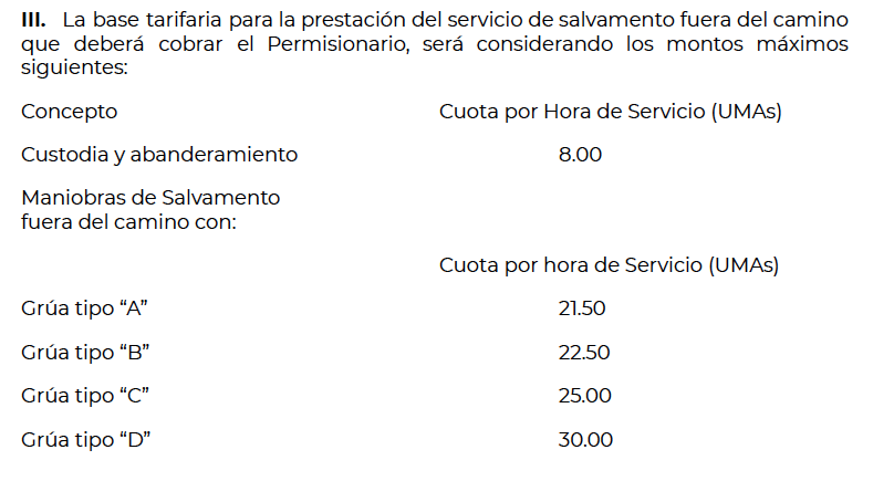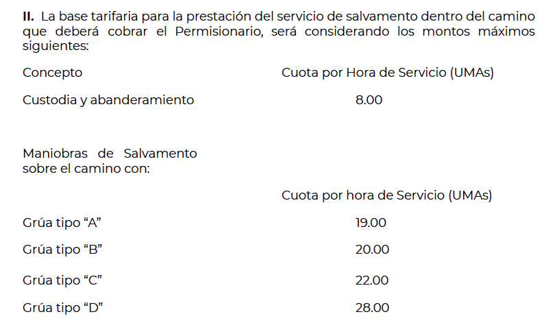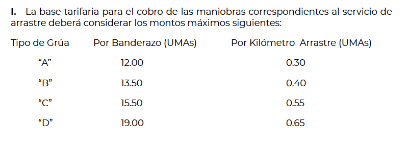 Los permisionarios están obligados a respetar y sujetarse en todo momento a las tarifas máximas establecidas en el tabulador del reglamento de grúas.