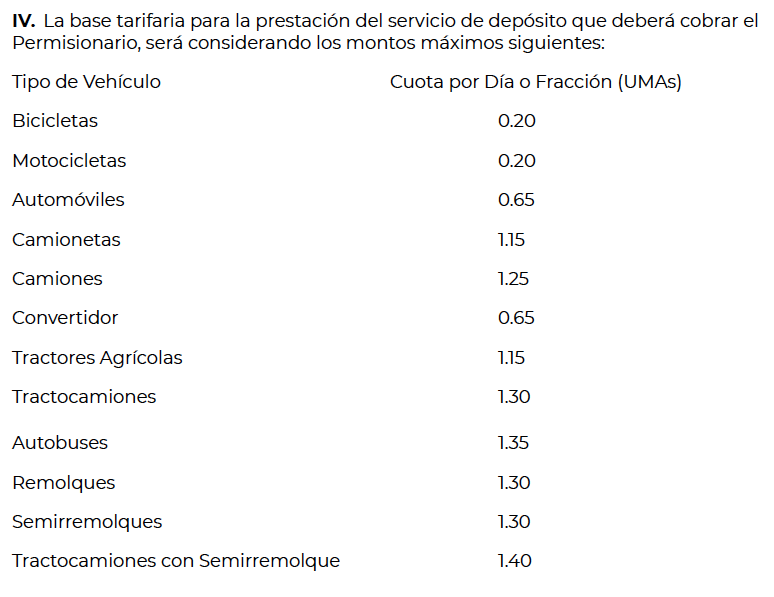 El servicio de depósito de un tractocamión de configuración sencilla será cobrado como un solo vehículo con independencia de que se encuentre desarticulado; en el caso las configuraciones full, se cobrará el tractocamión con el primer semirremolque como un solo vehículo y el segundo remolque o semirremolque como un vehículo independiente.