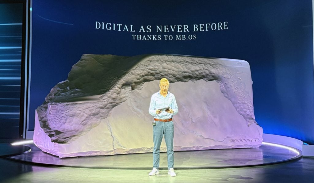 Estuvimos frente a “THE BOuLDER”, una escultura monumental que parecía cobrar vida bajo las luces del escenario. Tallada como si la piedra guardara el alma de la próxima generación de la Sprinter, es un auténtico símbolo de la solidez y evolución de un vehículo que, desde hace 30 años, ha sabido adaptarse a los tiempos sin perder su esencia: ser la herramienta más confiable para mover al mundo.