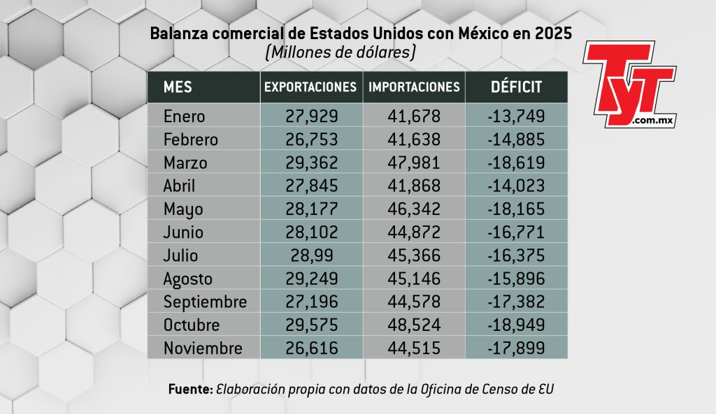Con base en estas cifras, el déficit comercial de Estados Unidos con México ascendió a 182,714 millones de dólares en los primeros 11 meses de 2025, lo que lo colocó como el segundo país con el que registra el mayor déficit.