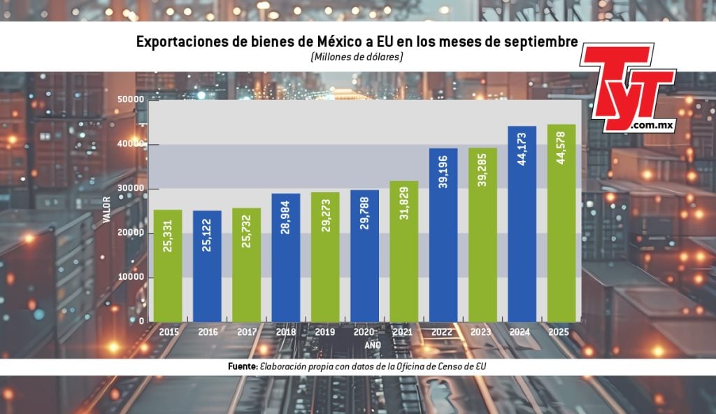 Por segundo mes consecutivo, México fue el principal destino de las exportaciones estadounidenses, con un total de 27,196 millones de dólares, y en el acumulado de enero a septiembre el valor de la mercancía ascendió a 253,607 millones de dólares.