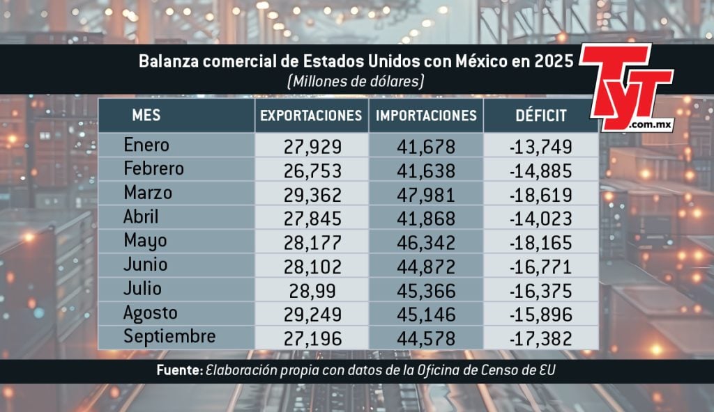En el acumulado de los primeros nueve meses de 2025, Estados Unidos importó desde México 399,473 millones de dólares, lo que representó el 16.2% de las importaciones totales de ese país y superó con amplitud a sus principales competidores: Canadá (11.6%) y China (8.5%).
