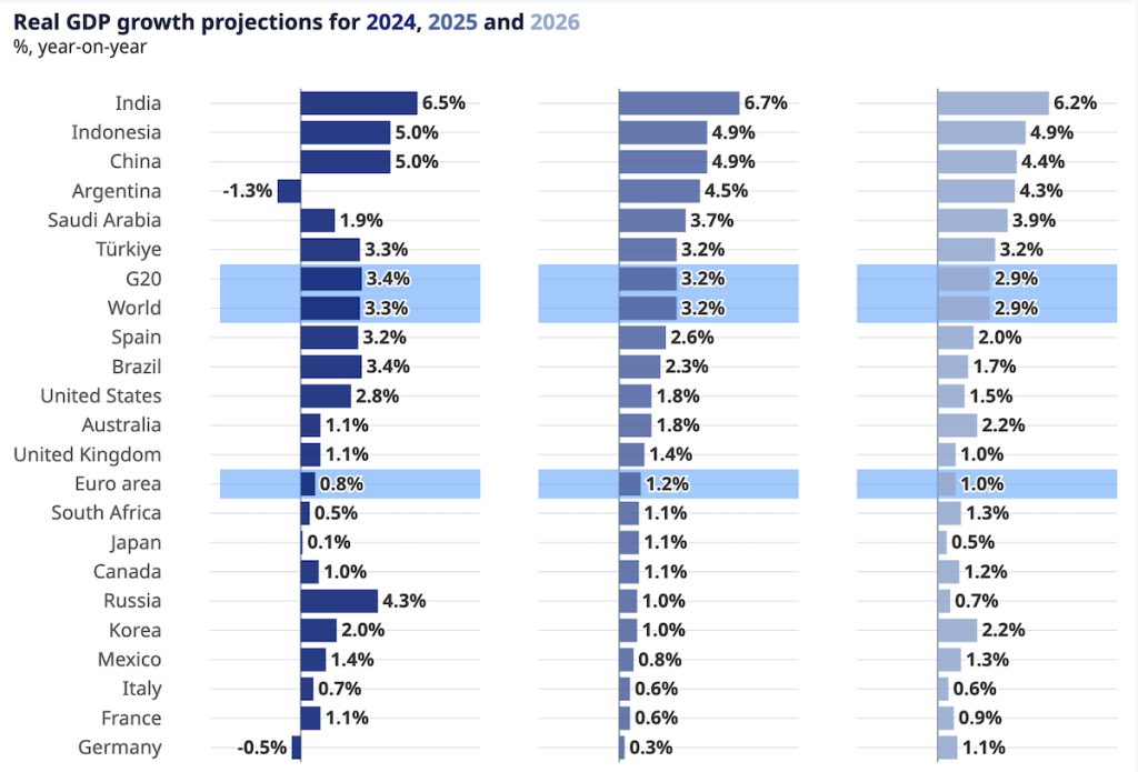 Las proyecciones de la OCDE para México van en línea con su estimado del PIB mundial, que prevé un crecimiento de 3.2% para 2025 y de 2.9% en 2026.