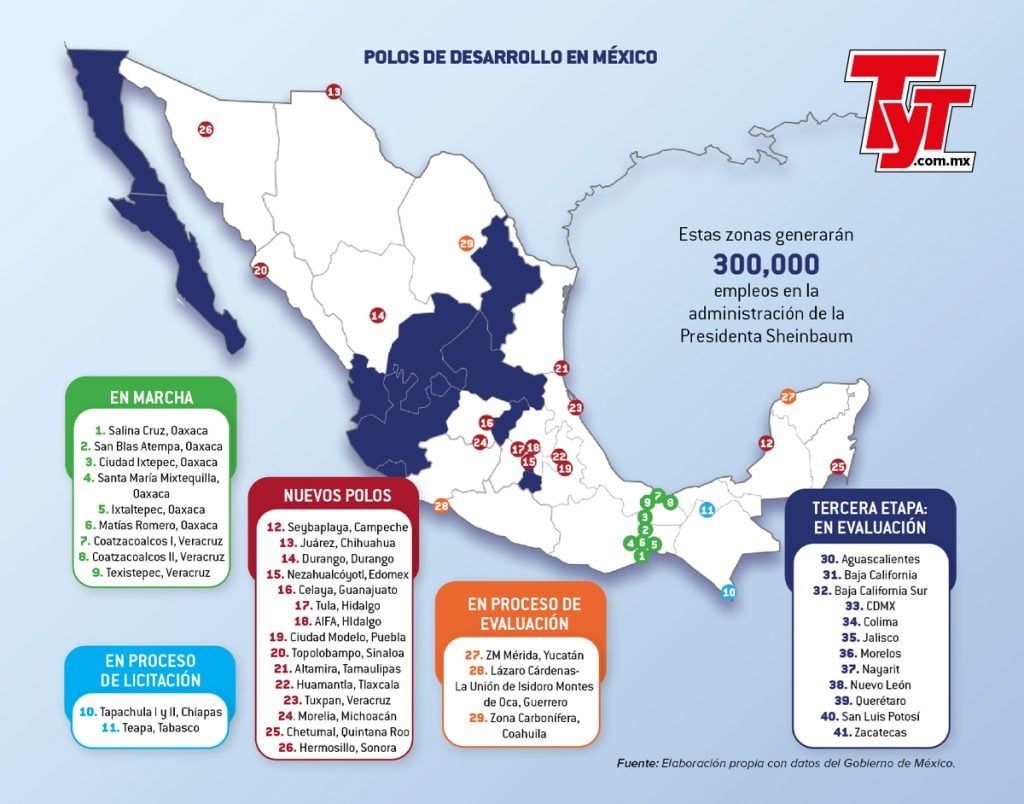 Como parte del Plan México, la Presidenta Claudia Sheinbaum Pardo impulsa el desarrollo de los Polos del Bienestar, que en una primera etapa se pusieron en marcha los primeros 15 en los estados de Campeche, Chihuahua, Durango, Estado de México, Guanajuato, Hidalgo, Michoacán, Puebla, Quintana Roo, Sinaloa, Tamaulipas, Tlaxcala, Veracruz y Sonora.