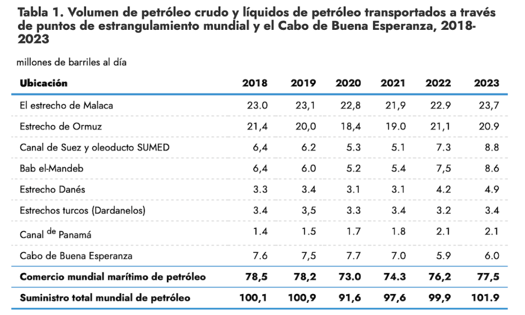 De acuerdo con datos de la Administración de Información Energética (EIA, por sus siglas en inglés), la mayoría de los volúmenes que transitan por este estrecho no dispone de rutas alternativas para salir de la región.