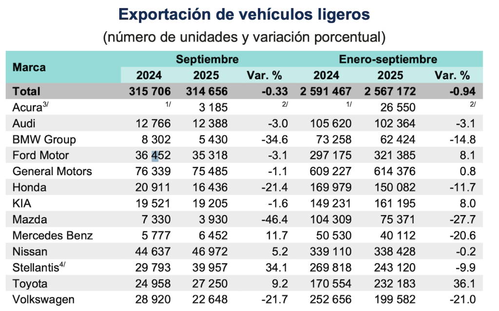 En el acumulado de los primeros nueve meses del año, se han exportado 2 millones 567 mil 172 vehículos ligeros, una caída de 0.94% respecto al mismo periodo del año pasado.