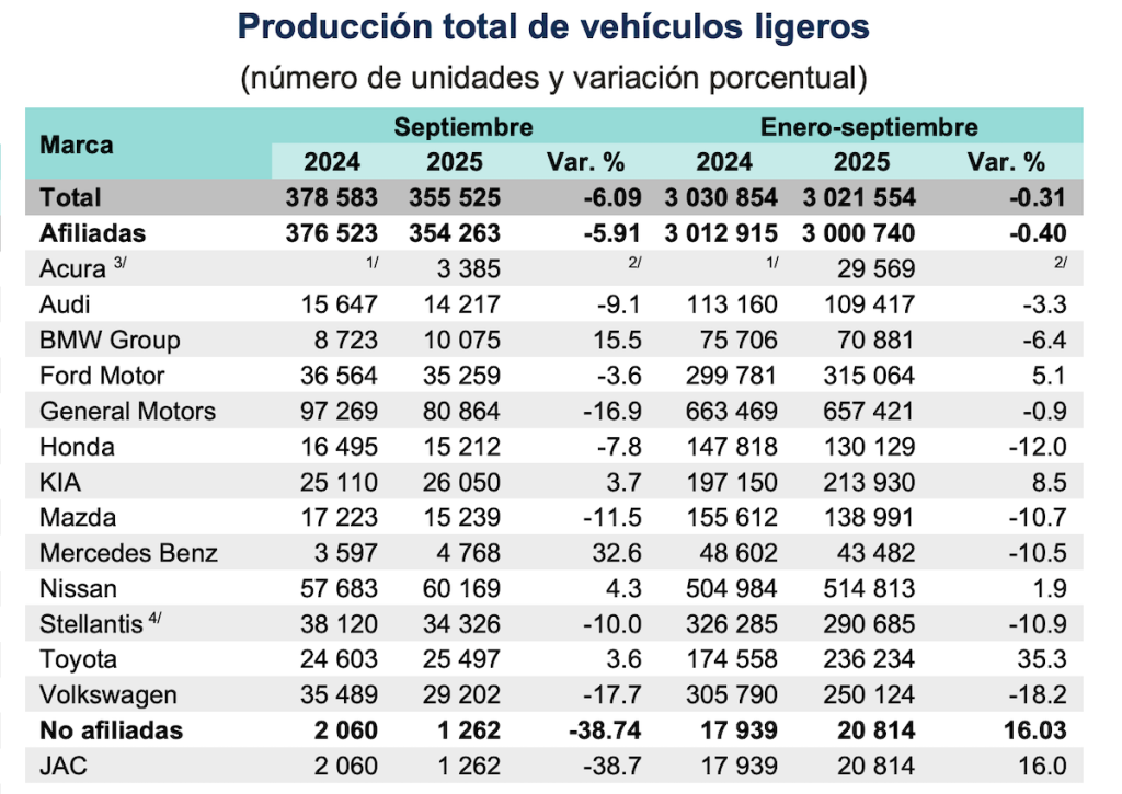 En el acumulado de enero a septiembre, la producción de vehículos ligeros fue de 3 millones 021 mil 554 unidades, lo que representó una ligera caída de 0.3 % respecto al mismo lapso de 2024, siendo la primera contracción para un mismo periodo desde el 2020.