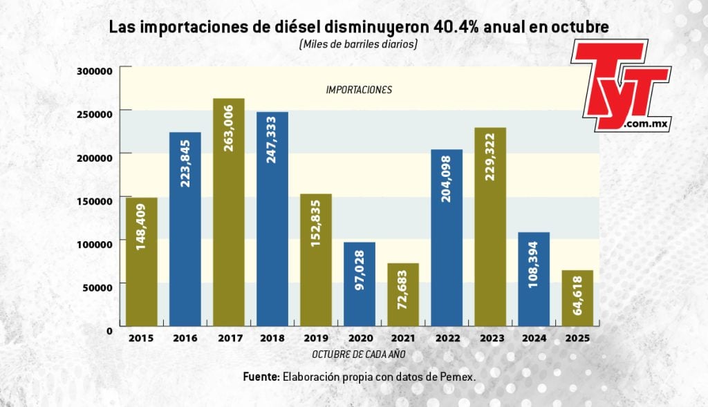 Con ello, las importaciones de petrolíferos registraron en octubre su nivel más bajo para un mes similar desde 2015.