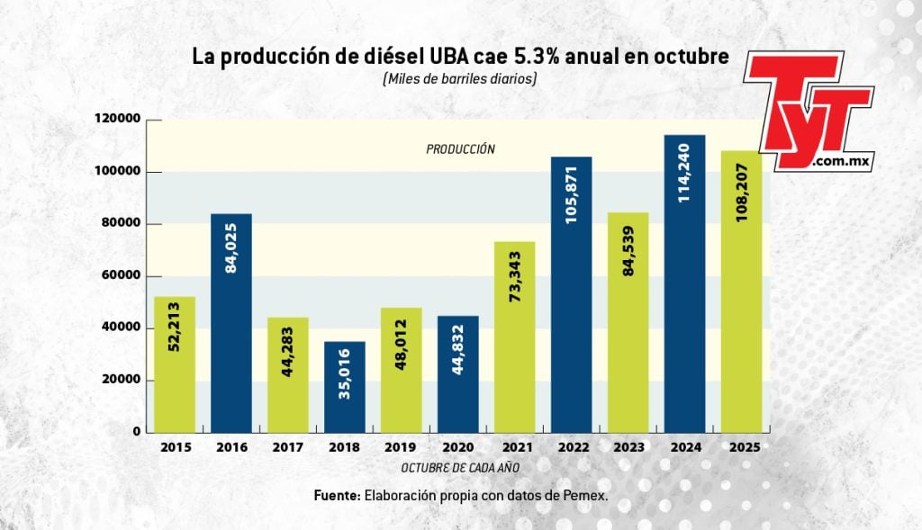 En el décimo mes del año, Pemex refinó 108,207 barriles diarios de este combustible —que contiene un máximo de 15 partes por millón de azufre—, lo que representó una caída anual de 5.3%.