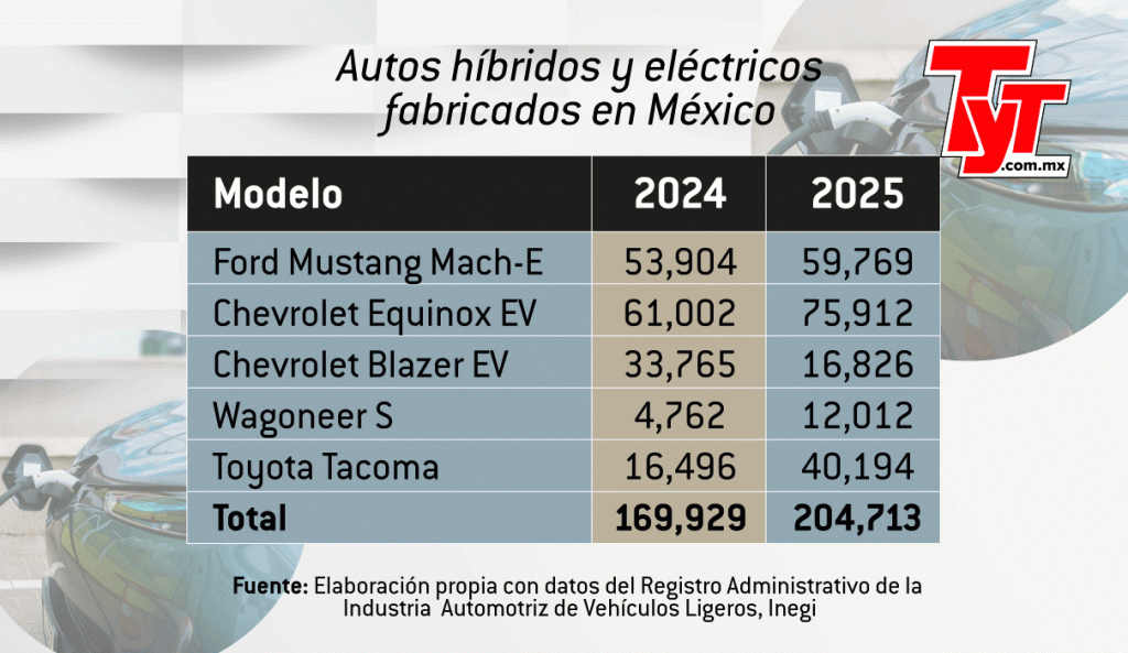 Para 2024, el número de los también llamados “autos verdes” que se ensamblan en el país aumentó a cinco modelos: Ford Mustang Mach-E, Chevrolet Equinox EV, Chevrolet Blazer EV, Jeep Wagoneer S y Toyota Tacoma HEV, de acuerdo con datos de la Asociación Mexicana de la Industria Automotriz (AMIA).