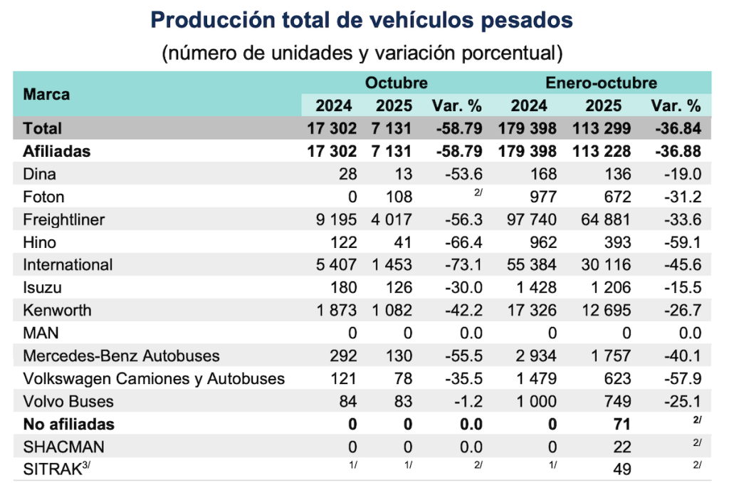 De acuerdo con el Registro Administrativo de la Industria Automotriz de Vehículos Pesados, del Instituto Nacional de Estadística y Geografía (Inegi), la producción de pesados se ubicó en 7,131 unidades, mostrando una caída anual de 58.8%, la máxima para un mes de octubre y la más pronunciada desde abril y mayo de 2020, los peores meses en el registro histórico.