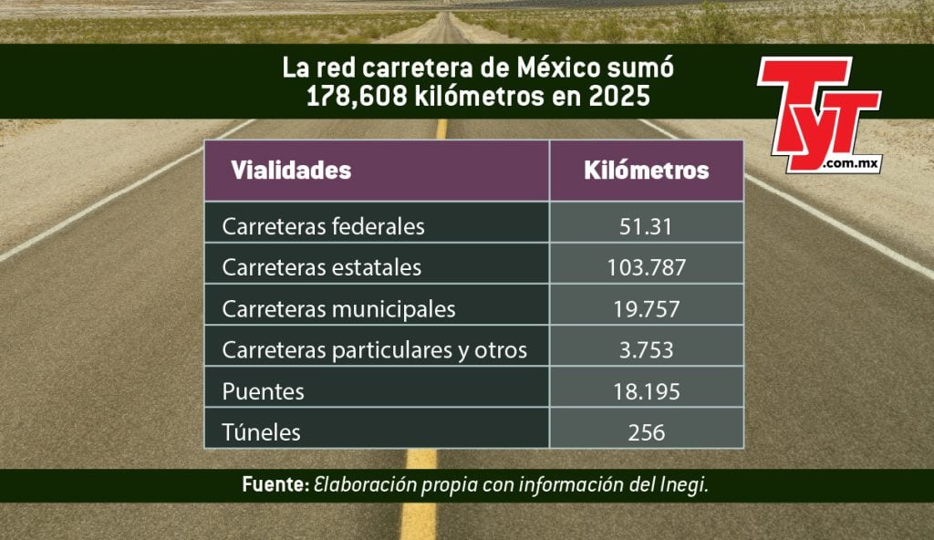 La red carretera de México sumó 178,608 kilómetros en 2025, ampliando la cobertura de vías federales y estatales para la movilidad de personas y mercancías en el territorio nacional, de acuerdo con datos del Instituto Nacional de Estadística y Geografía (Inegi).