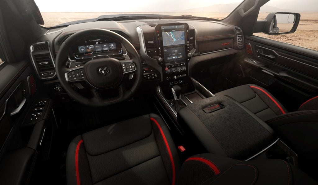 En el interior, la TRX 2027 ofrece asientos delanteros calefactables, ventilados y con masaje combinan con los asientos traseros reclinables, calefactables y ventilados, exclusivos en su clase. La cabina presenta detalles revestidos en piel y gamuza, mientras que la pantalla táctil Uconnect 5 de 14.5”, la doble plataforma de carga inalámbrica y el sistema de audio Harman Kardon de 19 bocinas reflejan el vanguardismo de su tecnología.