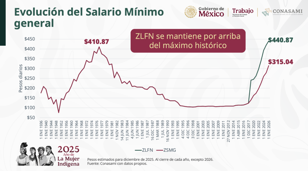 En la zona libre de la frontera norte, el salario mínimo tendrá un incremento de 5% para 2026. Con este ajuste, las percepciones pasarán de 419.88 pesos a 440.87 pesos diarios, lo que representa un ingreso mensual de 13,409.80 pesos. Este aumento permitirá a los trabajadores adquirir 2.8 canastas básicas, detalló el titular de la STPS.