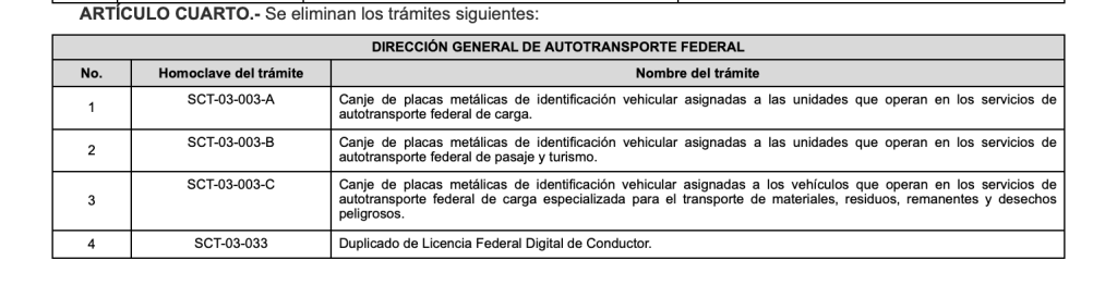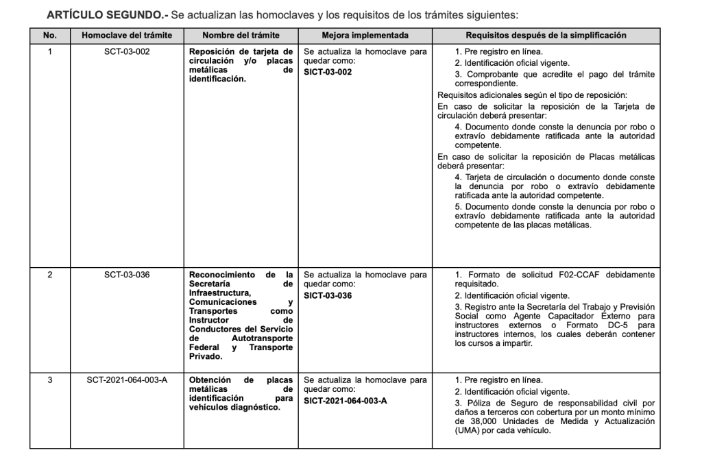 La Secretaría de Infraestructura, Comunicaciones y Transportes (SICT) publicó en el Diario Oficial de la Federación (DOF) la eliminación de cuatro trámites, incluido el canje de placas, así como acciones de fusión y simplificación que involucran a 17 trámites y la actualización de homoclaves para el autotransporte federal.