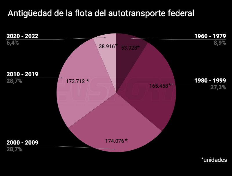 Considerando camiones y tractocamiones, la SICT tiene registradas 53,928 unidades fabricadas entre 1960 y 1979, así como 165,458 que se ubican en el rango de 1980 y 1999; 174,076 pertenecientes a 2000 a 2009, siendo este rango el de mayor participación, con el 28.7% del total de la flota.