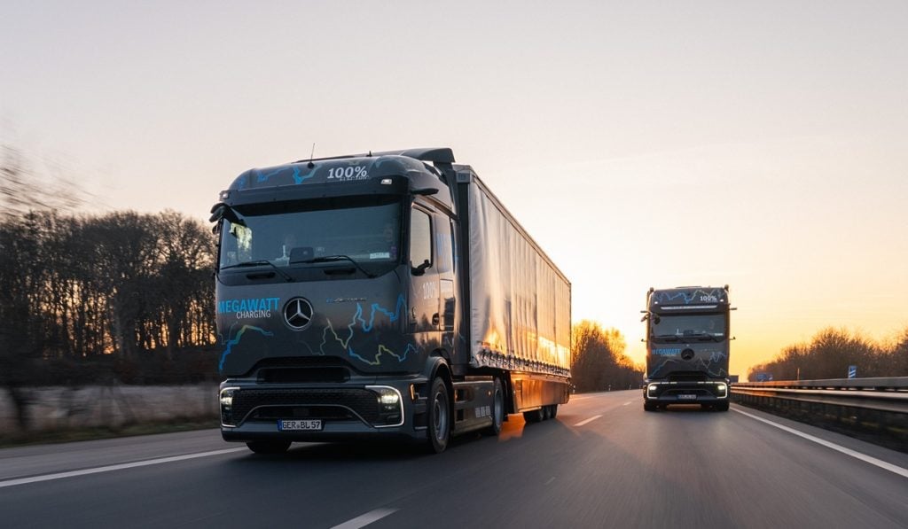 Daimler Truck explicó que, la ruta de prueba cubrió aproximadamente 2,400 kilómetros, desde Alemania, pasando por los Países Bajos, Bélgica y Dinamarca, hasta Suecia. A lo largo del recorrido, los vehículos se cargaron tanto en estaciones MCS públicas como privadas diseñadas específicamente para camiones.