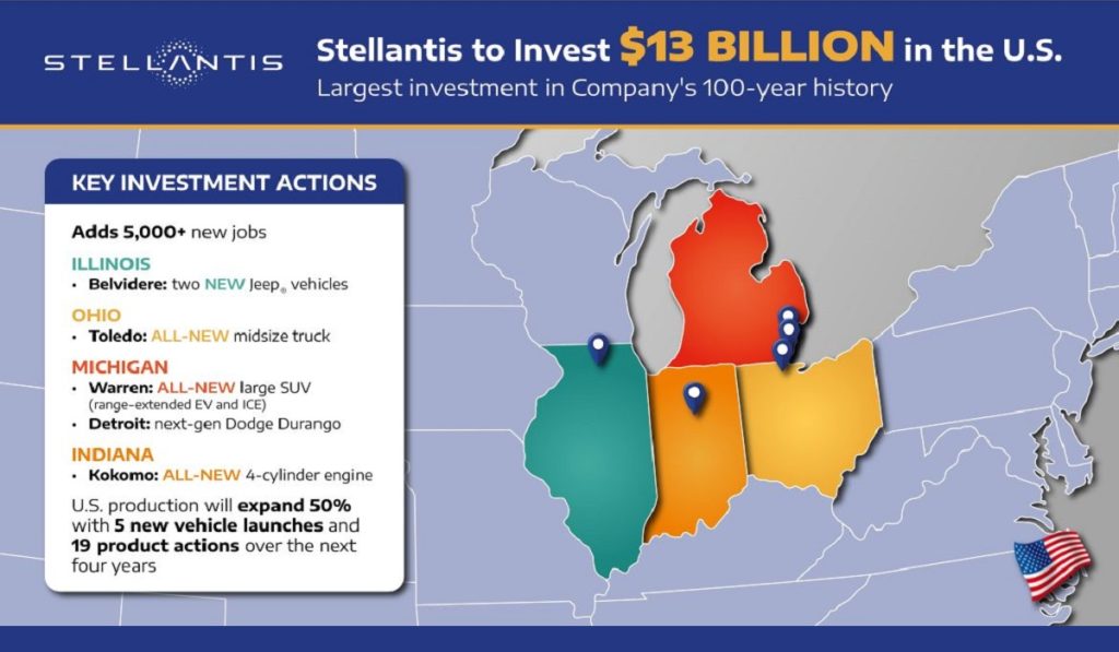 Stellantis anunció la mayor inversión individual en los 100 años de historia de la compañía, que beneficia a todas las plantas de ensamblaje de Estados Unidos. Se trata de la inversión de 13,000 millones de dólares (mdd) durante los próximos cuatro años.
