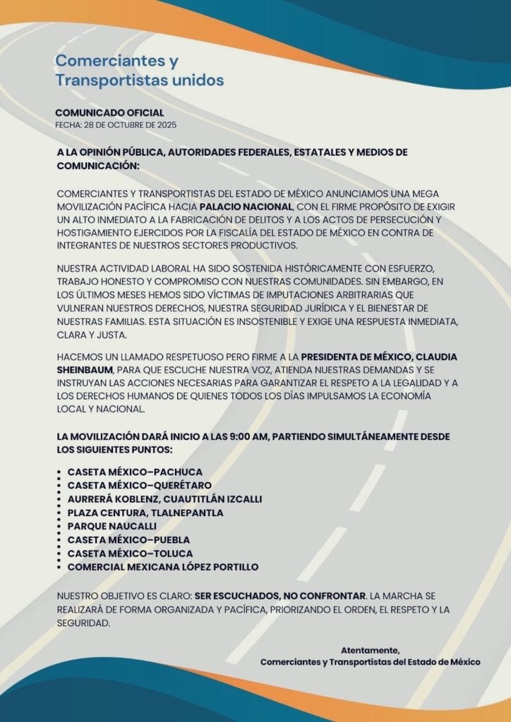 Los Comerciantes y Transportistas Unidos del Edomex confirmaron que la salida simultánea de esta movilización partirá desde 8 casetas y puntos clave rumbo a Palacio Nacional, en la Ciudad de México, por lo que las autoridades recomendaron a la población tomar precauciones.