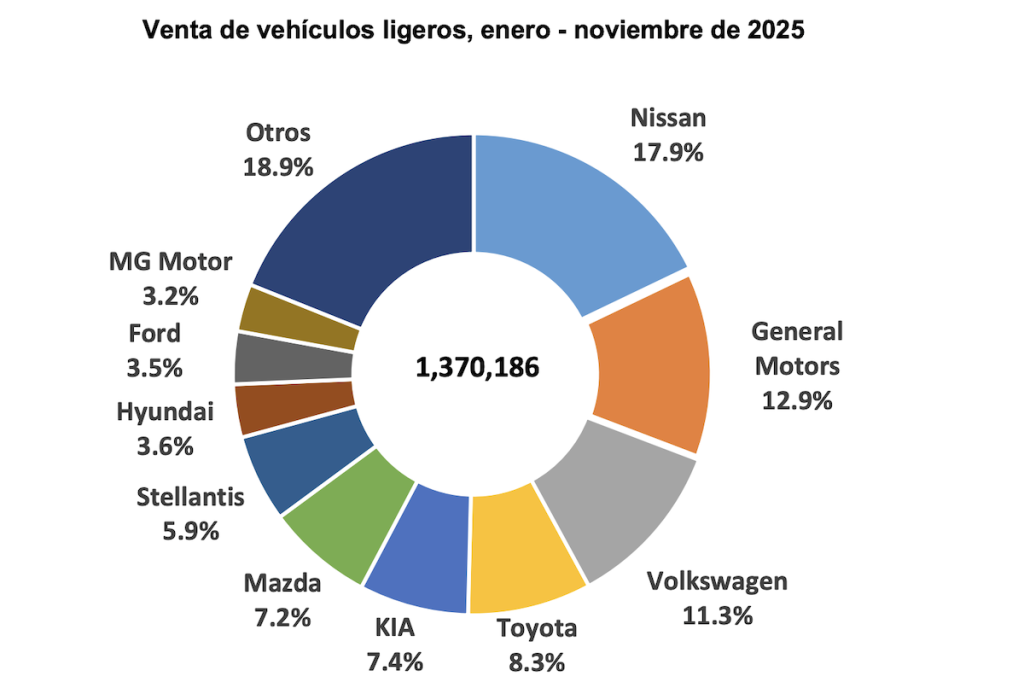 En el acumulado de enero a noviembre, las cifras muestran que se comercializaron 1 millón 370 mil 186 vehículos ligeros, cifra 1% superior al 1 millón 357 mil 182 unidades registradas en el mismo lapso de 2024, lo que representa un incremento de 13,004 autos nuevos.